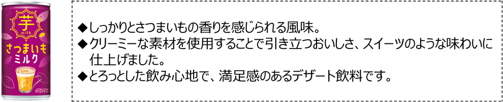 「さつまいもミルク」は、さつまいものほっこりする香りとクリーミーな甘さで、スイーツのような味わいをお楽しみいただける、秋冬シーズンにぴったりなデザート飲料です。