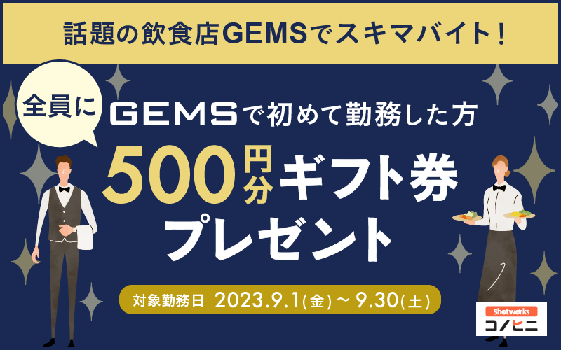 『ショットワークスコノヒニ』から対象勤務日の飲食テナント「GEMS」の求人に応募し、初めて「出勤」された方全員にAmazonギフトカード(Eメールタイプ) を500円分プレゼント!