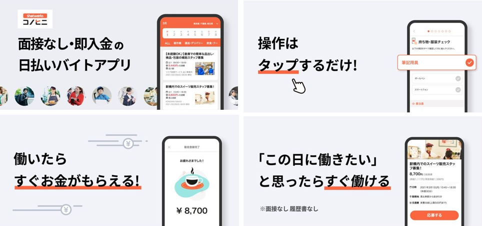 1日単位のアルバイトがかんたんに探せて、選考なしですぐ働けるアルバイトマッチングアプリです。(ご紹介・インストールURL:https://konohini.jp/)