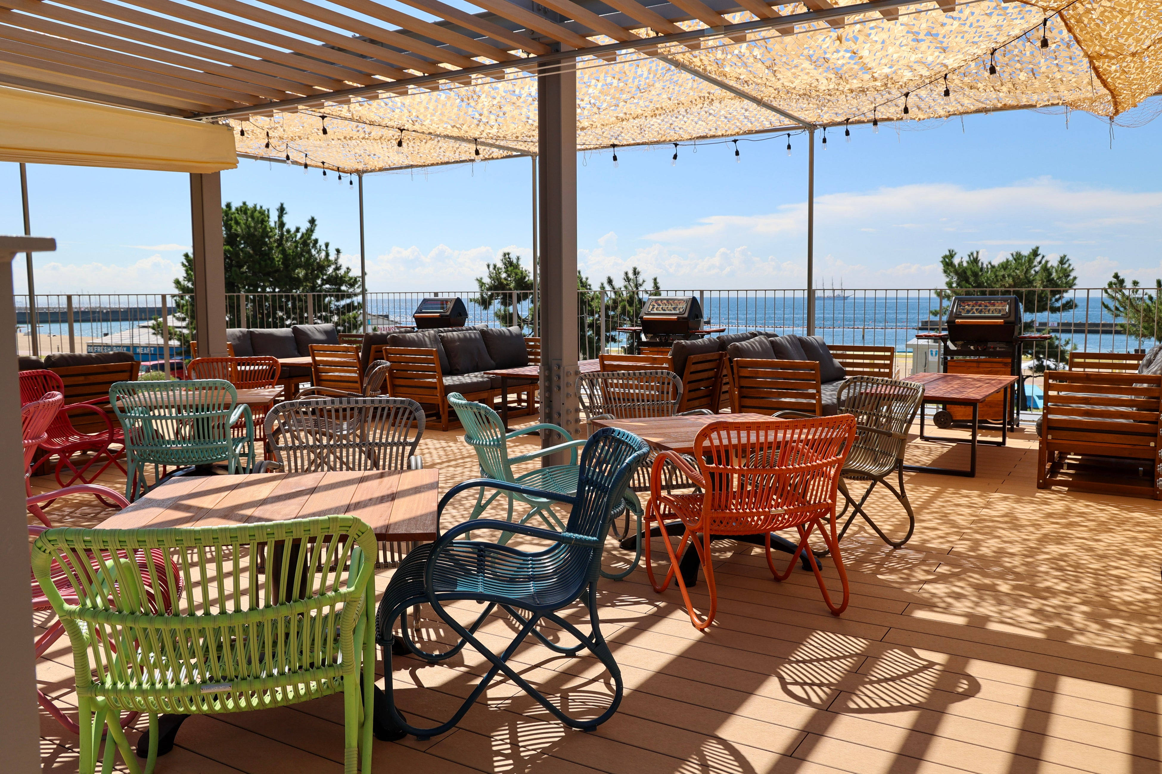カフェの屋上スペースで、潮風を感じる約70席のルーフトップエリア。