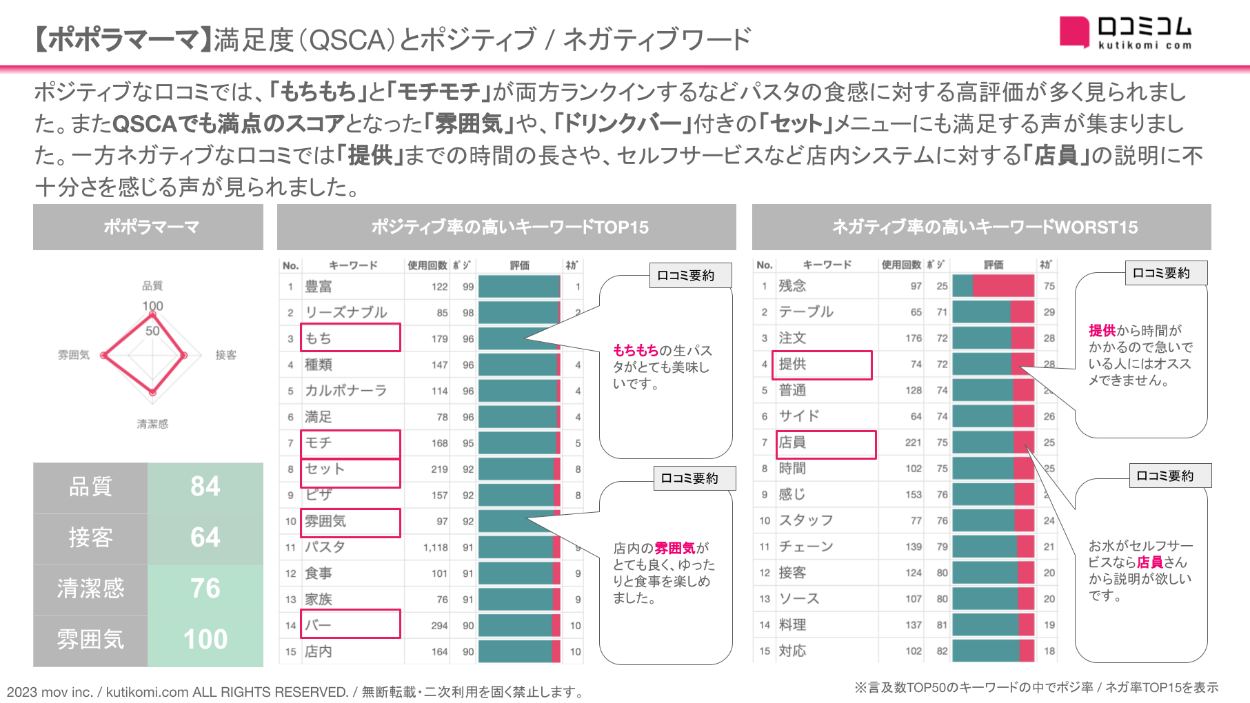 今回は、このAI解析を用いて【ポポラマーマ】 のQSCA・ポジ / ネガキーワードを確認しました。