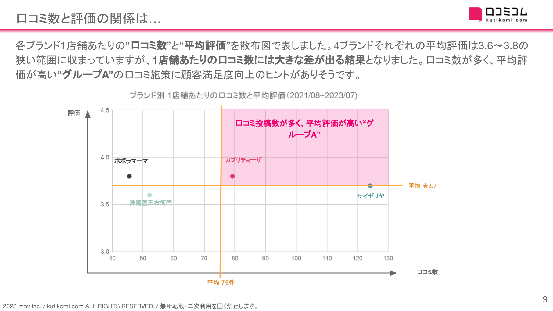 各ブランド1店舗あたりの“口コミ数”と“平均評価”を散布図で表しました。4ブランドそれぞれの平均評価は3.6~3.8の狭い範囲に収まっていますが、1店舗あたりの口コミ数には大きな差が出る結果となりました。口コミ数が多く、平均評価が高い“グループA”の口コミ施策に顧客満足度向上のヒントがありそうです。