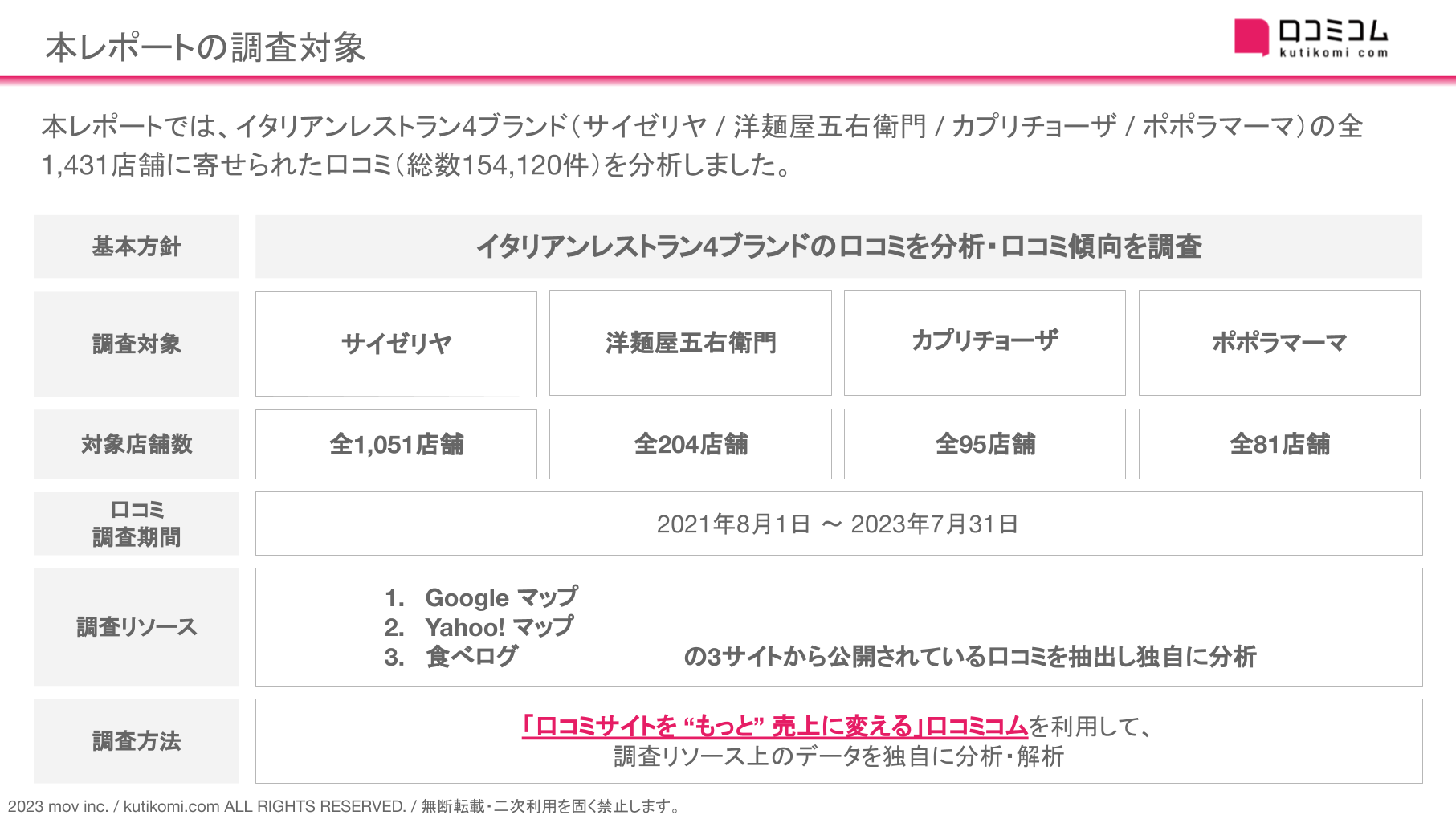 今回は、イタリアンレストラン4ブランド(サイゼリヤ / 洋麺屋五右衛門 / カプリチョーザ / ポポラマーマ)の全1,431店舗に寄せられた口コミ(総数154,120件)を分析しました。