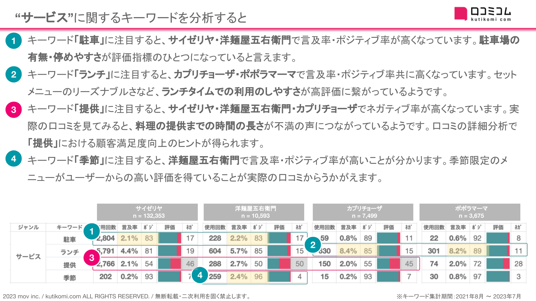 キーワード「ランチ」に注目すると、カプリチョーザ・ポポラマーマで言及率・ポジティブ率共に高くなっています。セットメニューのリーズナブルさなど、ランチタイムでの利用のしやすさが高評価に繋がっているようです。
