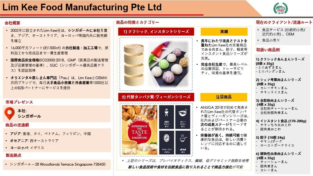 リムキーは、30年以上の業界経験を持つシンガポールの中華まん製造会社です。リムキーはこれまで海外戦略の一環として、イギリス、オーストラリア、カナダ、香港、ベトナムやカンボジアなどに進出してきました。リムキーの40種類を超える製品のうち海外輸出用中華まんの特徴は、原材料に牛肉や豚肉などの動物性たんぱく質を使用せず、全て代替たんぱく質を使用したヴィーガン中華まんであることです。規制などによる各国への輸出のハードルを下げるだけでなく、各国の消費者の信教にも配慮したサステイナブル製品群となっています。リムキーはこれまでの海外進出のノウハウを活かし、次の戦略として日本市場に参入したいと考え、GPCは支援を開始しました。