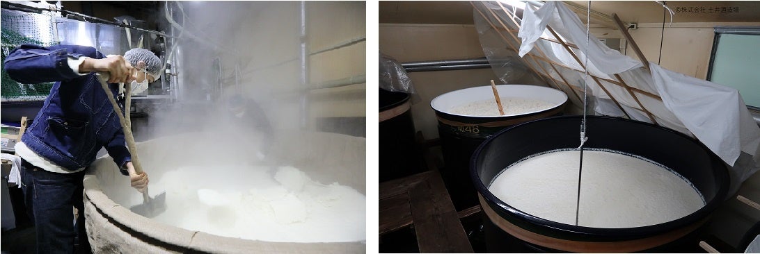 右下:原料となる米を発酵させ醪(もろみ)を育てているところ