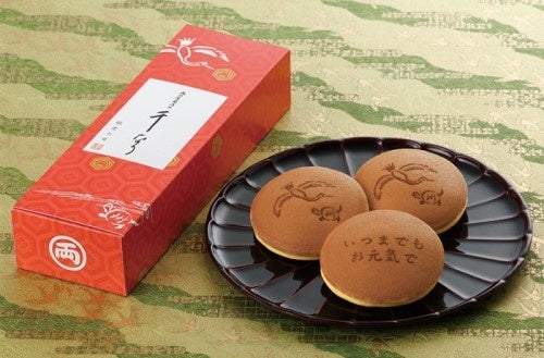 カステラ風のしっとりした焼皮に、長寿のシンボル「鶴亀」の絵柄と「いつまでもお元気で」のメッセージの焼印を刻した2種類を、専用パッケージに詰め合わせました。