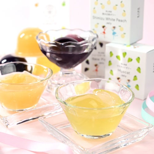 岡山県産果実を彩り鮮やかなゼリーにしました。 清水白桃、ニューピオーネ、マスカットの素材本来の味わいや風味を楽しむ事ができるデザートです。