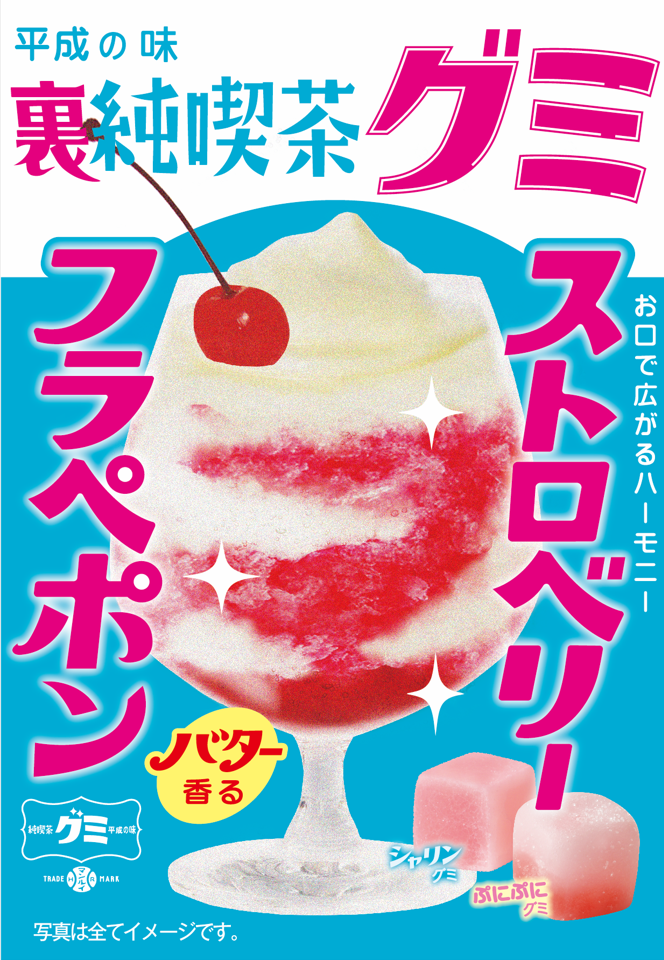 ストロベリーフラぺポンは「フラッペ=かき氷」をイメージした濃厚なイチゴ味にミルク感とバター風味をプラスした、食感の異なる2種のグミを一つの袋に閉じ込めました。