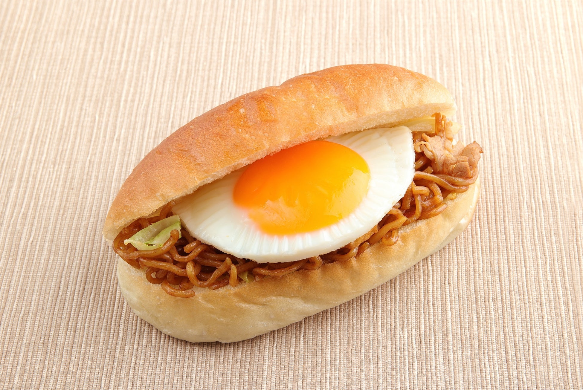 キャベツやちくわを混ぜたたっぷりのソース焼きそばに大きな目玉焼きをトッピング!焼きそばだけじゃ物足りない方におすすめのちょっぴりお得なコッペパン。