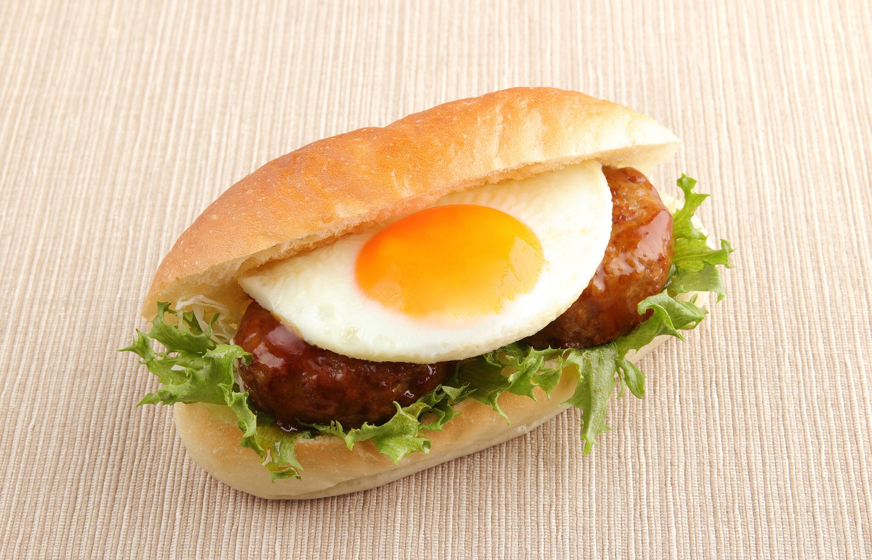 ジューシーな照り焼きハンバーグの上に月に見立てた目玉焼きをトッピング!ハンバーグと大きな目玉焼きが相性抜群のボリューム満点のコッペパン。
