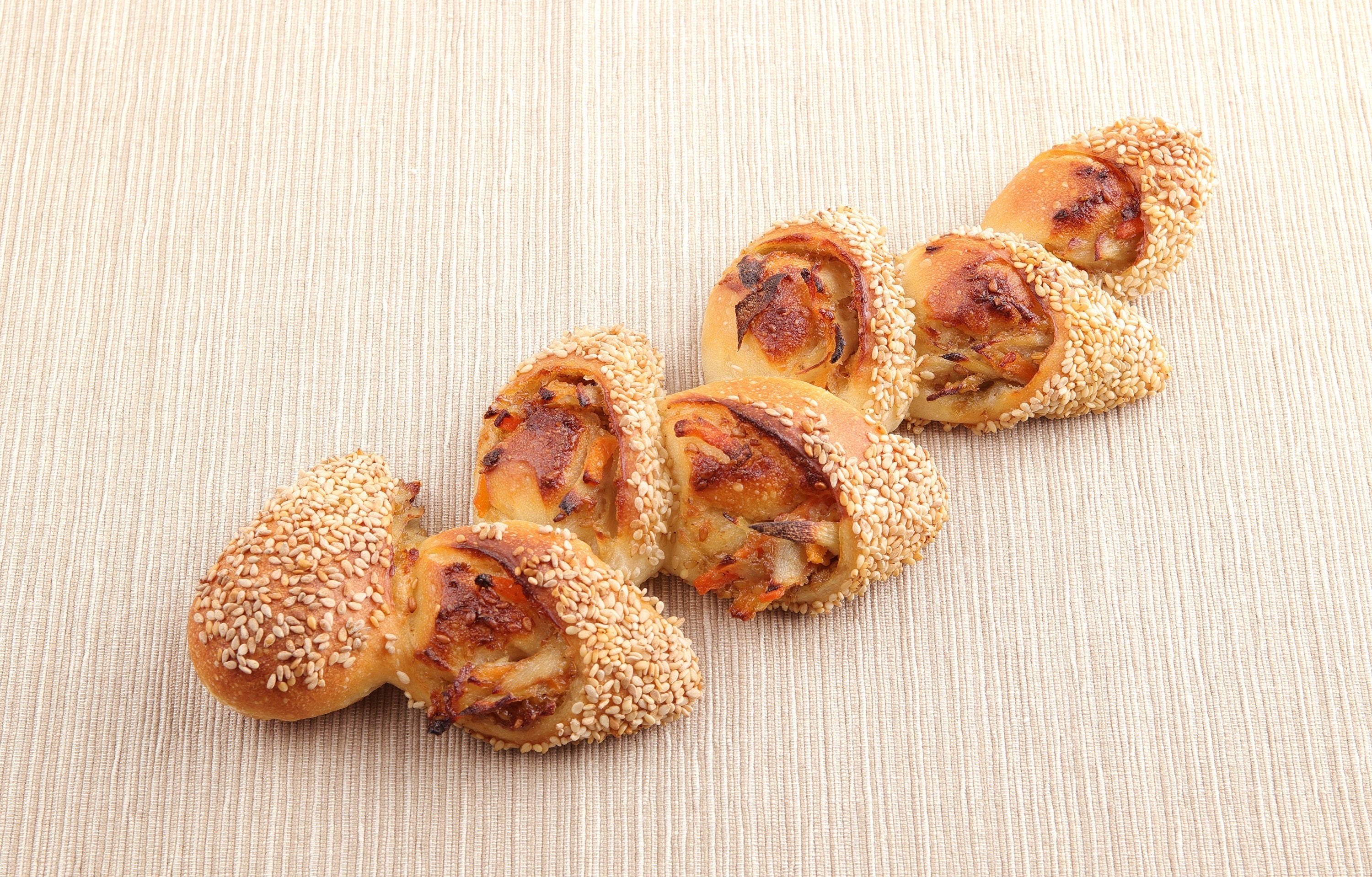 ごぼうサラダをフランスパンに巻き込んで香ばしく焼き上げました。ゴマたっぷりの歯ごたえあるフランスパンとシャキシャキごぼうの食感が楽しい一品。