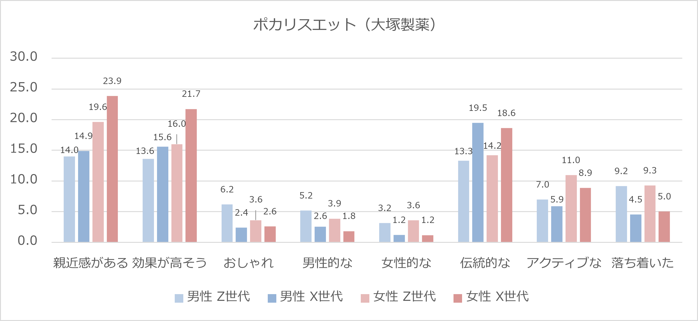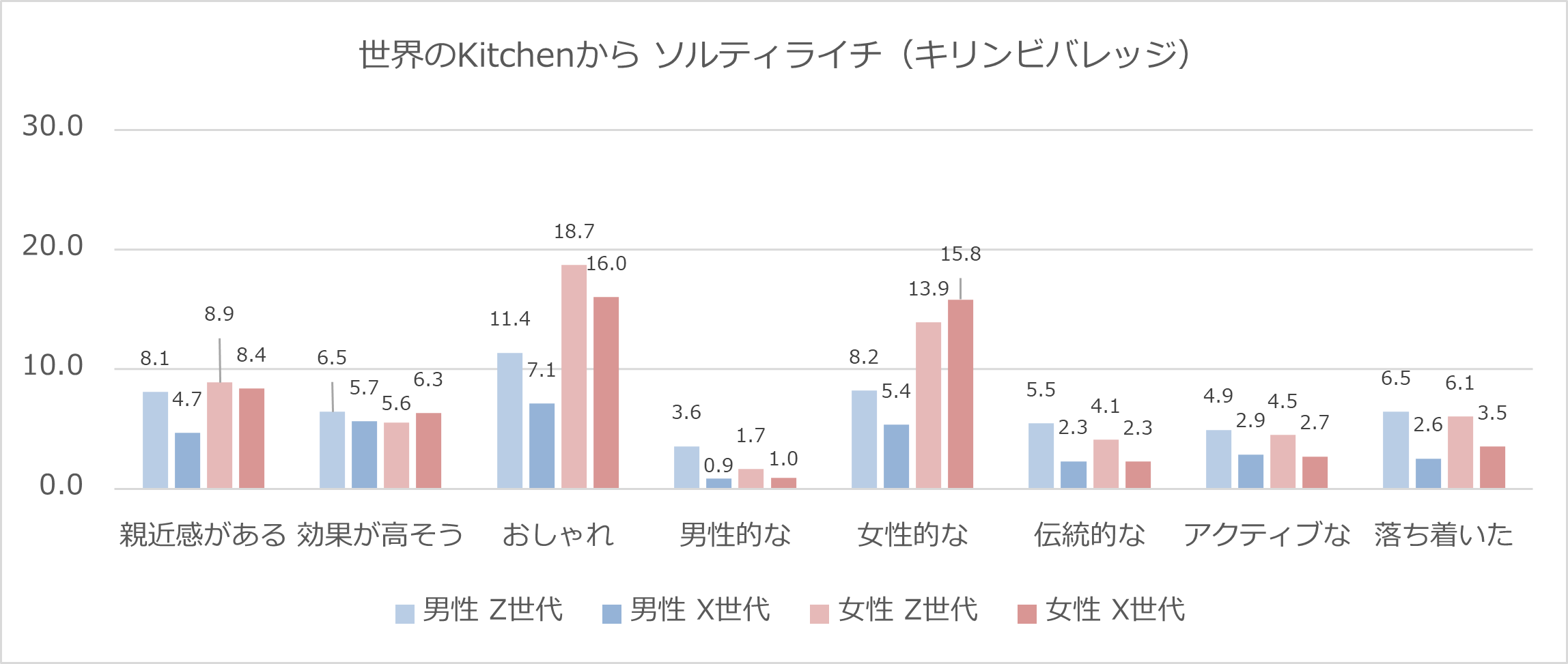 また、男女ともにZ世代から「伝統的な」というイメージを持たれている点も目を引きます。本商品は2011年発売。「比較的新しい商品」という印象を持つX世代と「子どものころからある商品」という印象を持つZ世代、というギャップがあるのではないでしょうか。