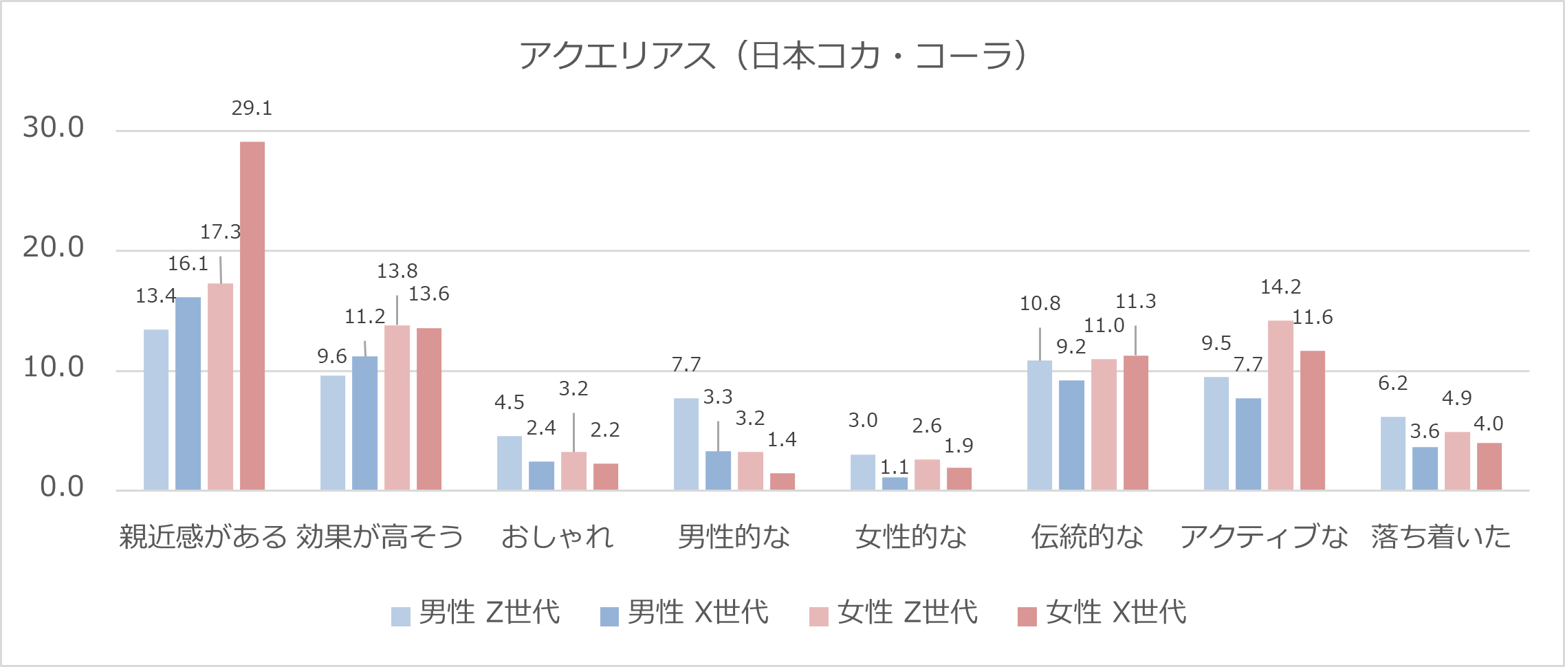 今年で発売40周年のアクエリアスですが、イメージ調査では「親近感がある」が際立っており、X世代女性から30%近い支持を集めました。