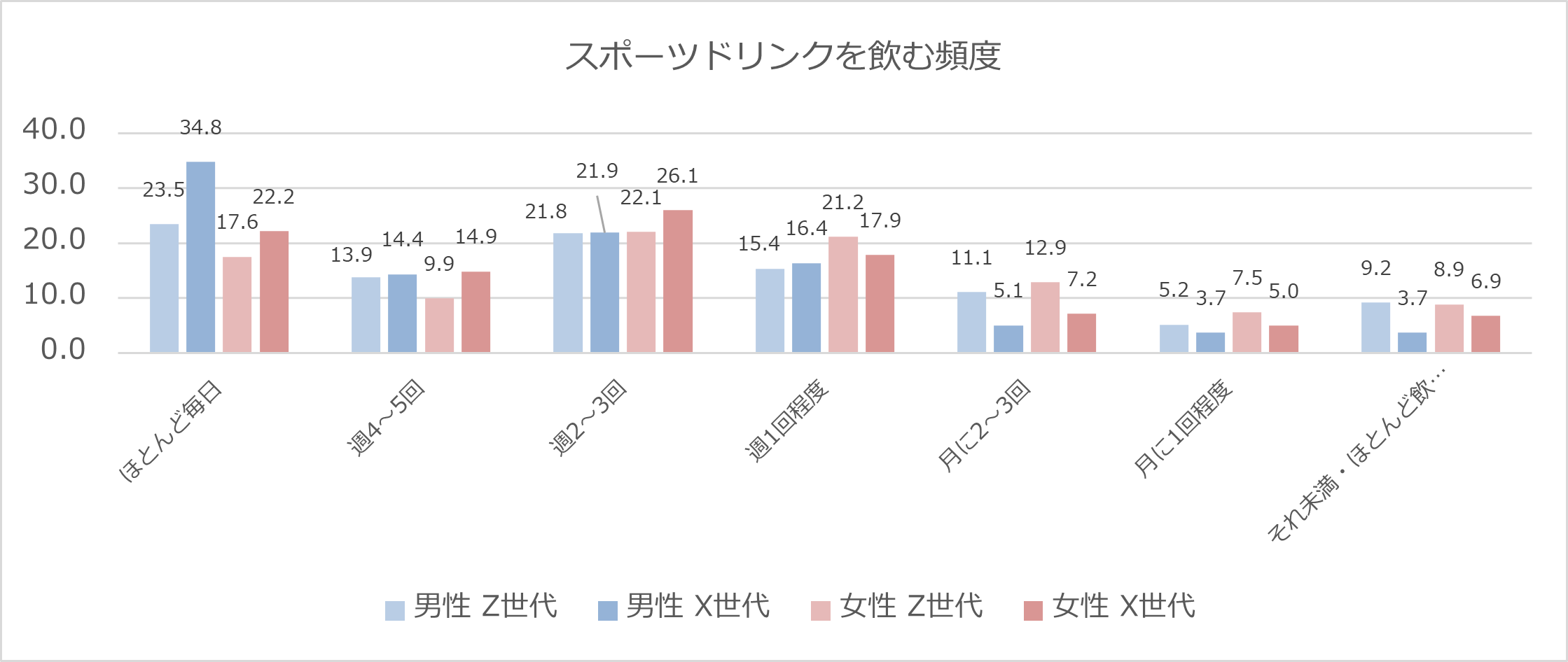 スポーツドリンクを飲む頻度を尋ねる質問では、男性X世代の約35%が「ほとんど毎日」飲んでいるという結果になりました。全体を比較すると、男性のほうが頻繁にスポーツドリンクを飲んでいる傾向がわかりました。