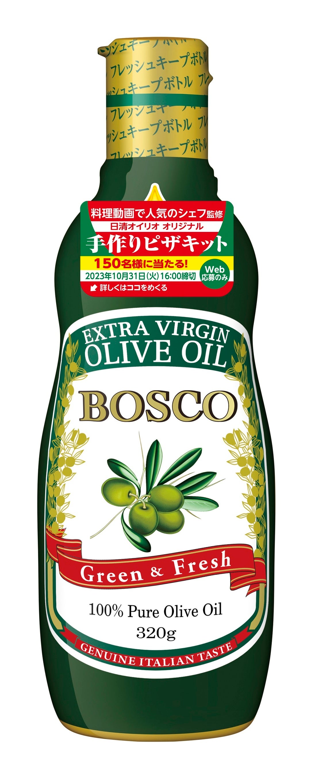 食卓でオイルをかけて、新鮮な風味を楽しむのにピッタリな「BOSCOエキストラバージンオリーブオイル320gフレッシュキープボトル」(キャンペーン告知シールが貼付されたものに限る)を購入して、ご応募いただいた方の中から抽選で150名様に、Chef Ropia※監修のオリジナル手作りピザキットをプレゼントいたします。Chef Ropiaが伝授するピザ作り動画も一緒に限定公開いたします。