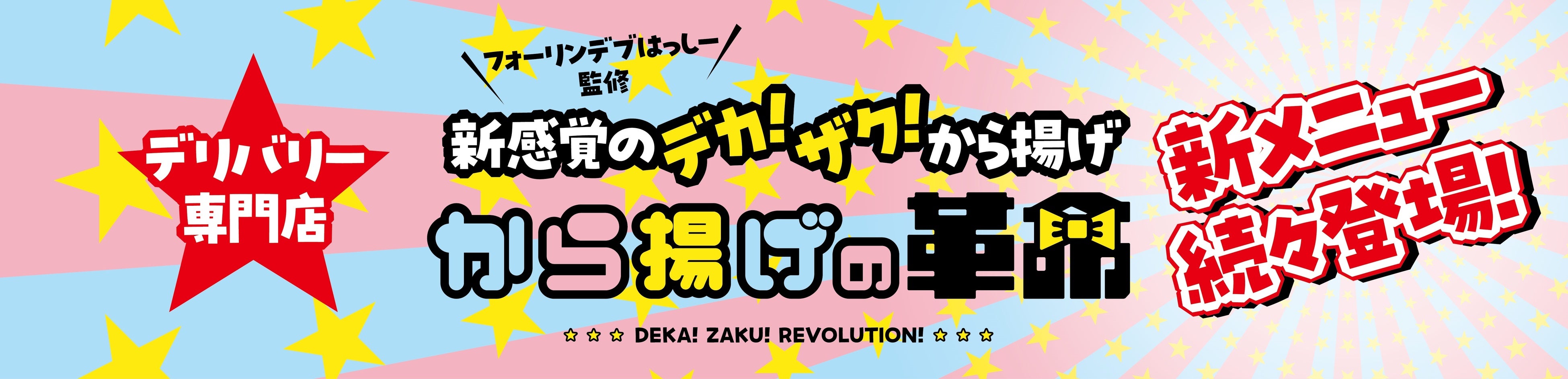 今年6月にオープンし、ご好評いただいているデリバリー専門店の新感覚からあげ『から揚げの革命』!監修に、SNSやテレビで大人気のグルメエンターテイナー・フォーリンデブはっしーをお迎えし、今までになかったデッカくて、ザックザクで、楽しい!から揚げが完成!ボリューミーでジューシーでクリスピーな美味しさが三拍子揃ったから揚げをバラエティ感のある多彩なディップソースでお楽しみいただけます。
