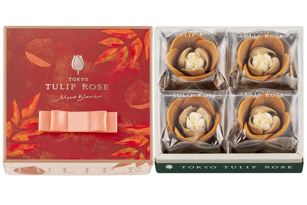 さらに、今年はパッケージデザインを一新!深みのある赤をベースに、天面や側面にも可愛らしく栗を描いた『チューリップローズ モンブラン』専用パッケージで登場です。ゴールドのチューリップローズのロゴに、サーモンピンクのリボンが大人可愛い雰囲気。秋の手土産にぴったりなパッケージですので、大切なあの人への贈り物におすすめです。もちろん自分用にしても!栗の魅力をたっぷりと詰め込んだ、今だけのチューリップローズをお楽しみください。