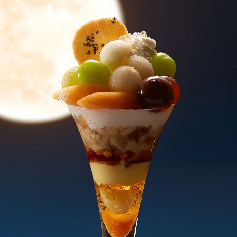 一年で最も美しいとされている「中秋の名月」を鑑賞しながら、収穫などに感謝する行事「十五夜」。2023年は9月29日(金)が十五夜です。秋のフルーツとともに、お月様やお団子をイメージしたパーツを組み合わせてパフェに仕立てています。