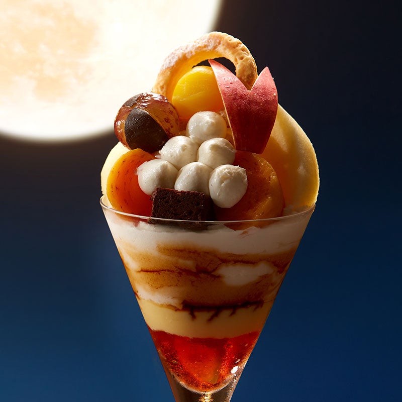 一年で最も美しいとされている「中秋の名月」を鑑賞しながら、収穫などに感謝する行事「十五夜」。2023年は9月29日(金)が十五夜です。秋のフルーツとともに、お月様やお団子をイメージしたパーツを組み合わせてパフェに仕立てています。