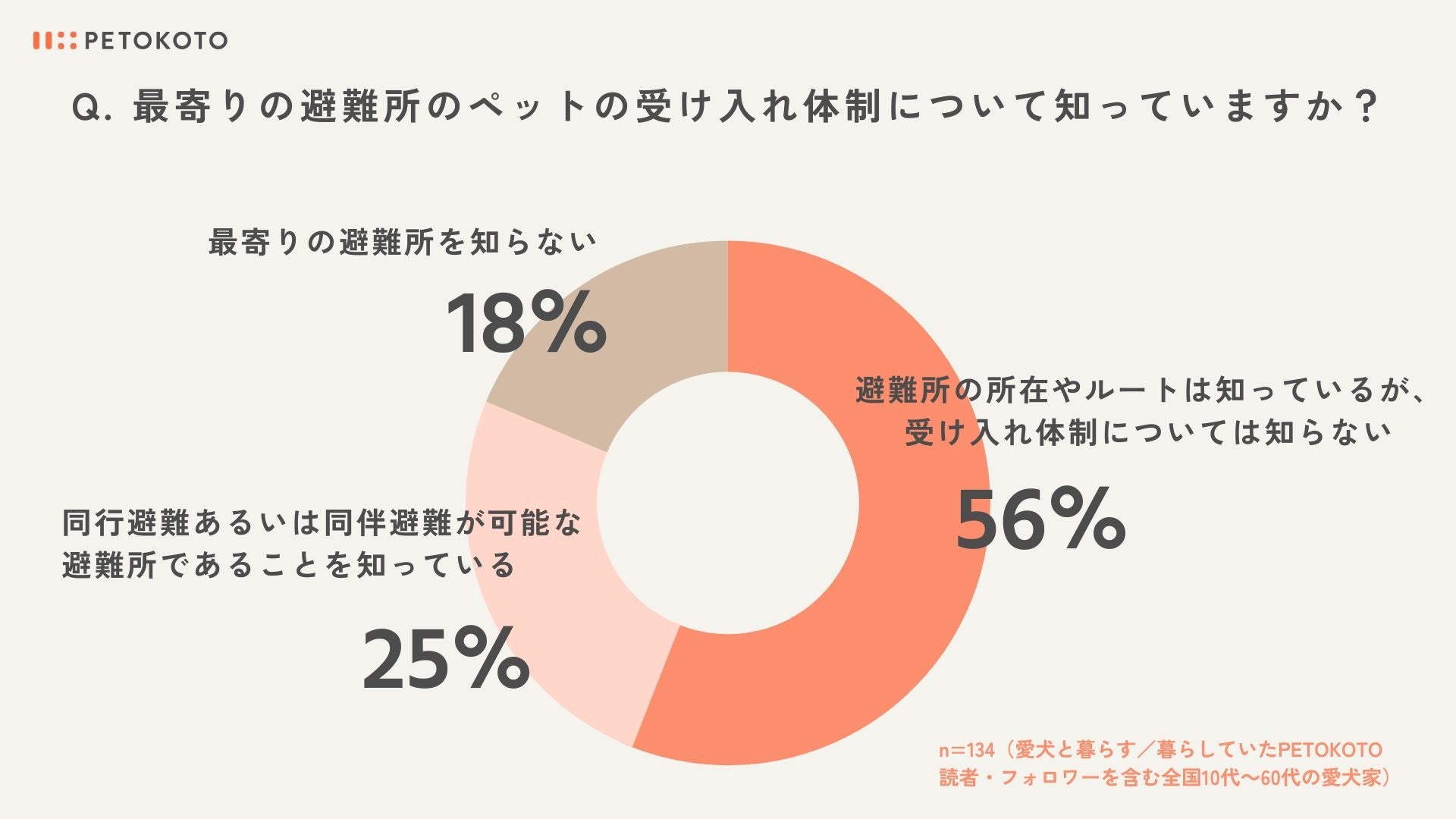 まずはじめに、災害時に想定している避難方法について問うたところ、73%の飼い主が在宅・車中避難と回答しました。続いて、最寄りの避難所のペットの受け入れ体制について知っているかという問いには、最寄りの避難所の所在やルートは知っているものの、ペットの受け入れ体制について知らないと回答した飼い主は過半数を超える結果に。避難所におけるペットの受け入れ体制は各自治体によって様々であるため、情報が行き届いていない実態やペットと同伴避難できる避難所自体の数の不足という課題が読み取れます。