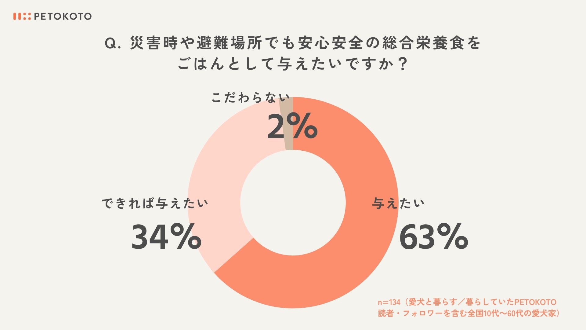 災害時や避難場所での愛犬のごはんとして総合栄養食を与えたいと回答した飼い主は97.7%(「与えたい」63.4%、「できれば与えたい」34.3%)にのぼりました。これはペットを家族の一員と大切に思い、非常時においても愛犬の健康を願う愛情の表れと考えられます。また、前問で「体調不良やメンタルヘルス」を危惧すると多くの飼い主が回答していることにも結びつきます。フリー回答では、人だけでなく、ペット用非常食や療養食の配布を望む声も聞かれました。
