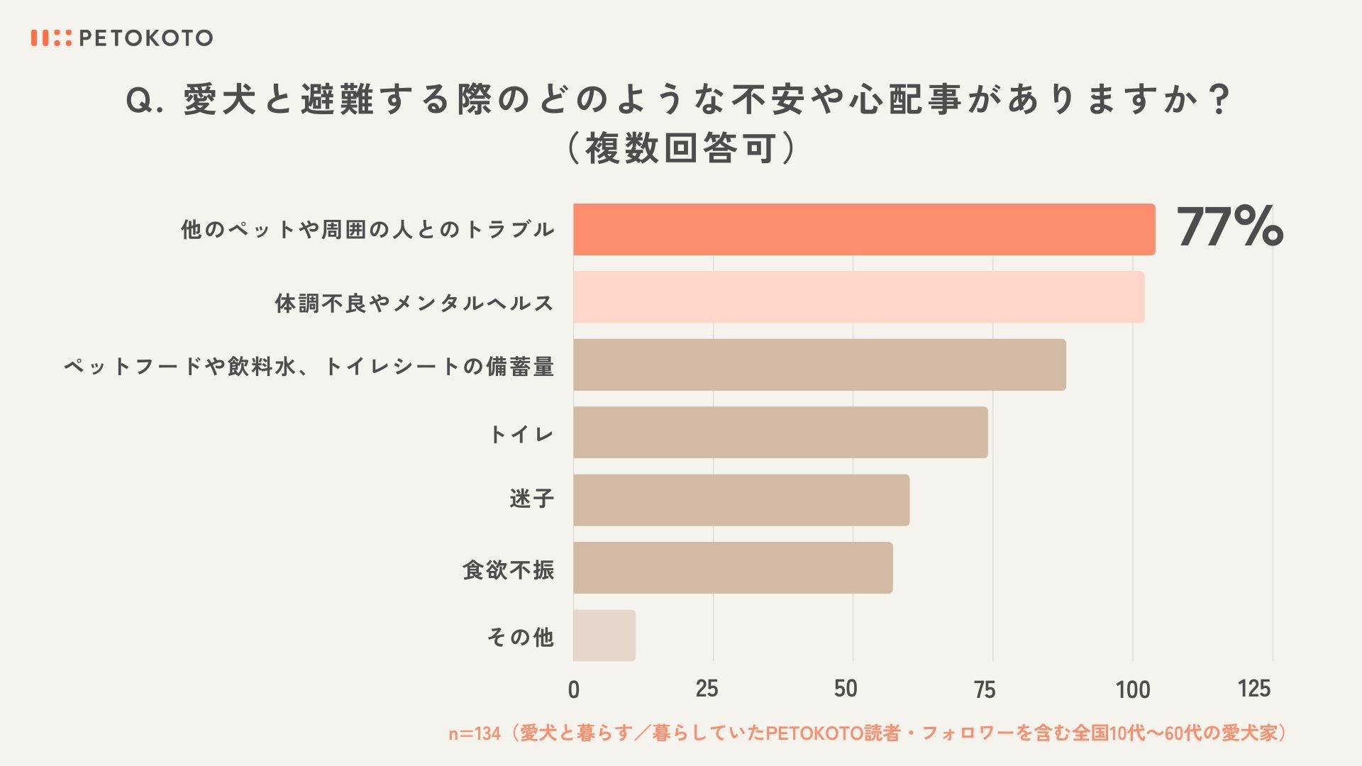 愛犬と避難する際の不安や心配事で最も多かった回答は、「他のペットや周囲の人とのトラブル(動物が苦手な人やアレルギーのある人への配慮も含む)」(77.6%)、次いで「体調不良やメンタルヘルス」(76.1%)という結果に。