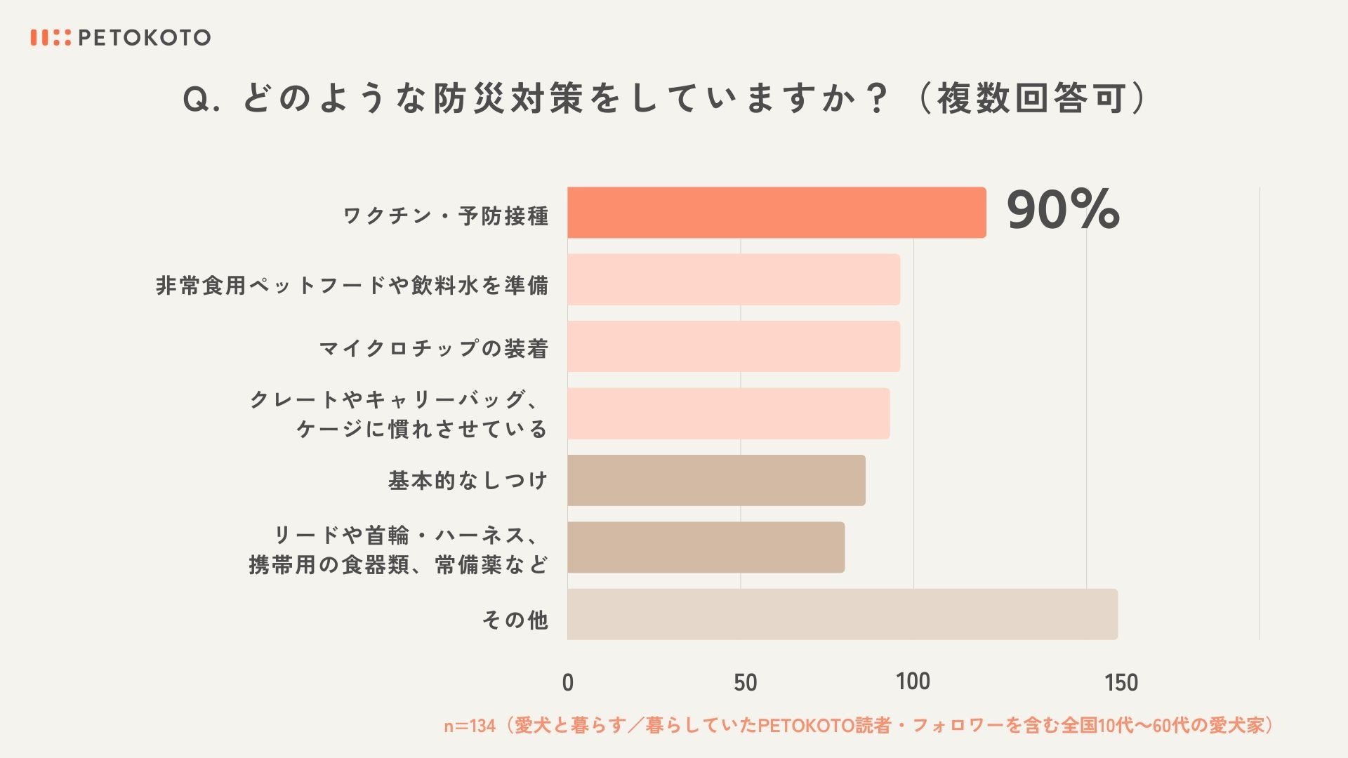防災対策をしていると回答した飼い主に対して、具体的にどのような対策を講じているかという問いに対して、最も多かった回答は「ワクチン・予防接種を済ませている」(90.3%)、次いで「非常食用ペットフードや飲料水を準備している」(71.6%)、「マイクロチップを装着している」(71.6%)ということがわかりました。一方で、有事の際の足裏の火傷や怪我の予防が期待できる「シューズや靴下の着用訓練」(13.4%)や、万が一の時に落ち着いて行動ができるよう備える「ペットとの非難訓練」(1.5%)は、日常生活ではまだ浸透していないことが伺えます。