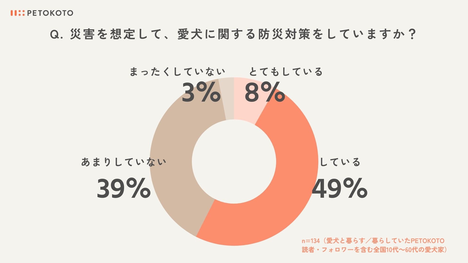 愛犬に関する防災対策については、講じている飼い主が57%(「とてもしている」8.2%、「している」49.3%)、していない飼い主が42.6%(「あまりしていない」39.6%、「まったくしていない」3%)と二極化しました。