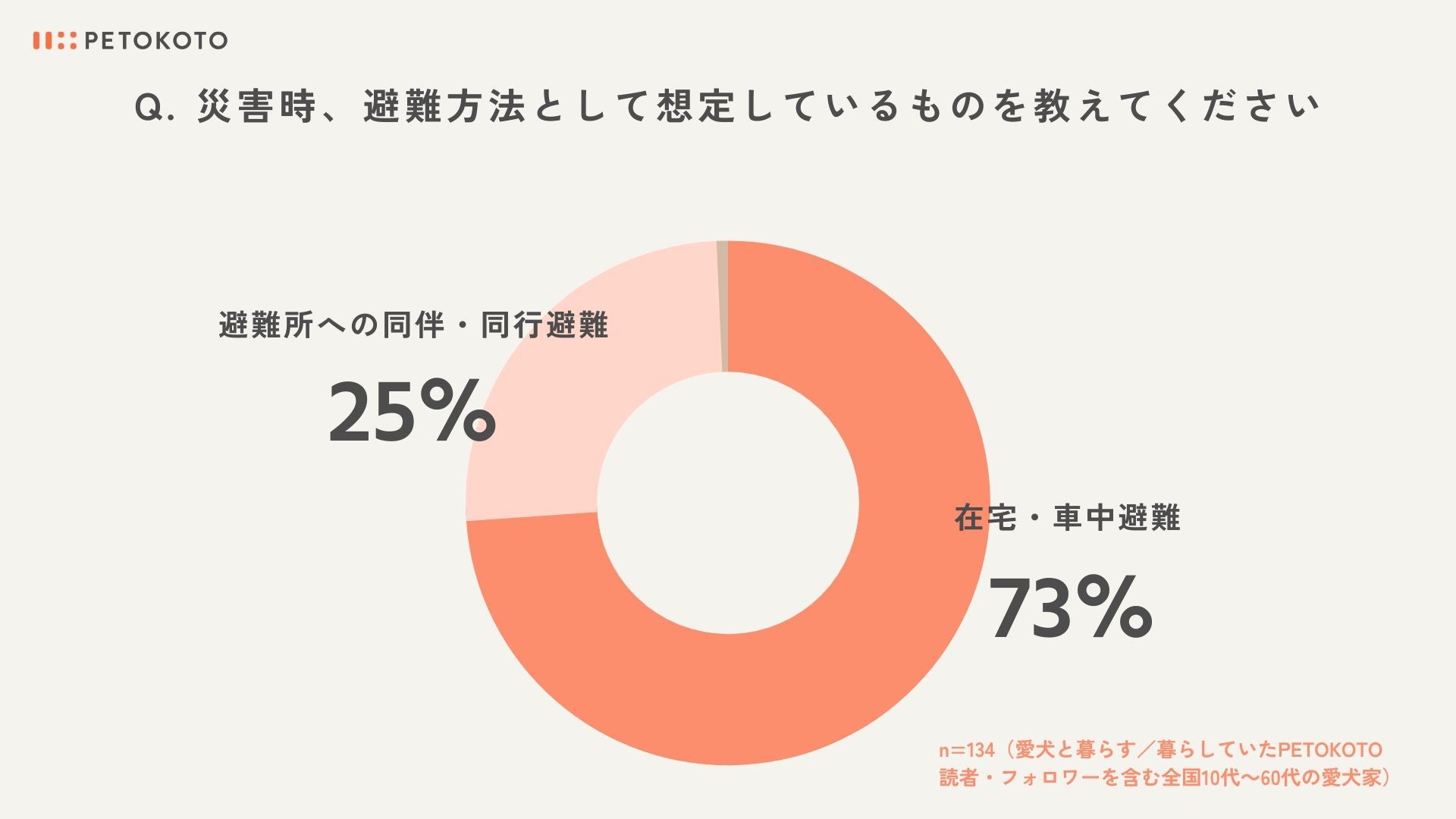 災害時の愛犬との避難方法として、73%の飼い主が在宅・車中避難を想定。背景に、避難所におけるペット受け入れ体制の情報不足やペット同伴可能な避難所の不足も。