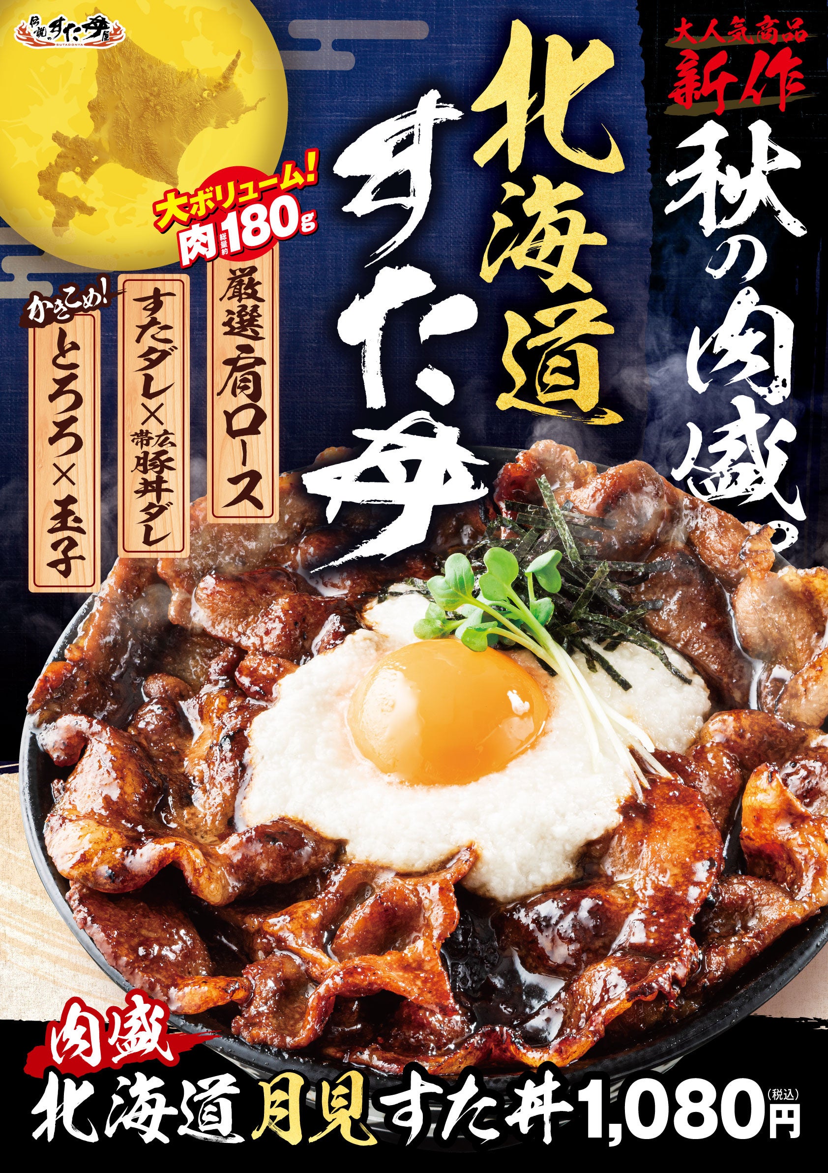 今回、『大盛り丼界のパイオニア』とし「旨くてすたみなが付く豪快肉丼で胃袋を満たして、頑張って欲しい」という想いのもと、肉量が従来の約150gから30g増量し約180gとなり『北海道すた丼』史上最大のボリュームとなっております。是非この機会に豚肉・月見とろろですたみなWチャージができる『肉盛北海道月見すた丼』をお召し上がりいただき、秋の夜長を満喫してみてはいかがでしょうか?