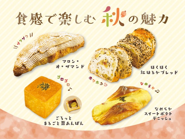 9月は「食感で楽しむ秋の魅力」をテーマに、ホクホクとした食感が美味しい”芋”やゴロゴロとした食感が嬉しい”栗”など食欲の秋ならではの食材の魅力を最大限に伝えるパンを発売いたします。