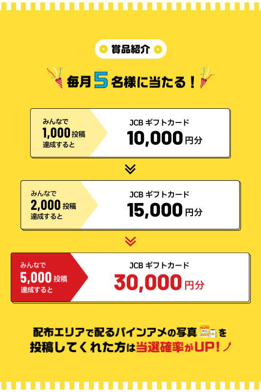 賞品金額は、それぞれの期間内のポスト数により1万円から最大3万円までアップします。