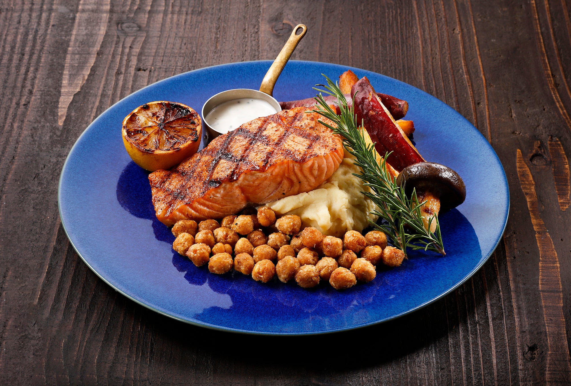 厚切りにカットした「アトランティックサーモン」をガラムマサラで風味付けしてグリルしました。付け合わせには、「紅はるか」「大黒本しめじ」のフライに加えて、インド料理によく使われる「ひよこ豆」のフリット(ガラムマサラ風味)を添えました。