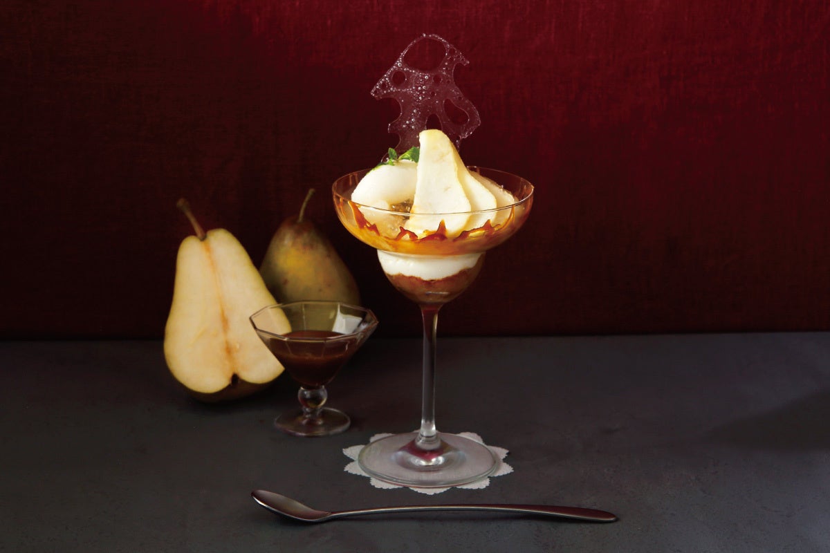 キャラメリゼした洋梨に、洋梨のコンポートジュレ、さらに洋梨のシャーベットを合わせた、洋梨づくしのパルフェ。