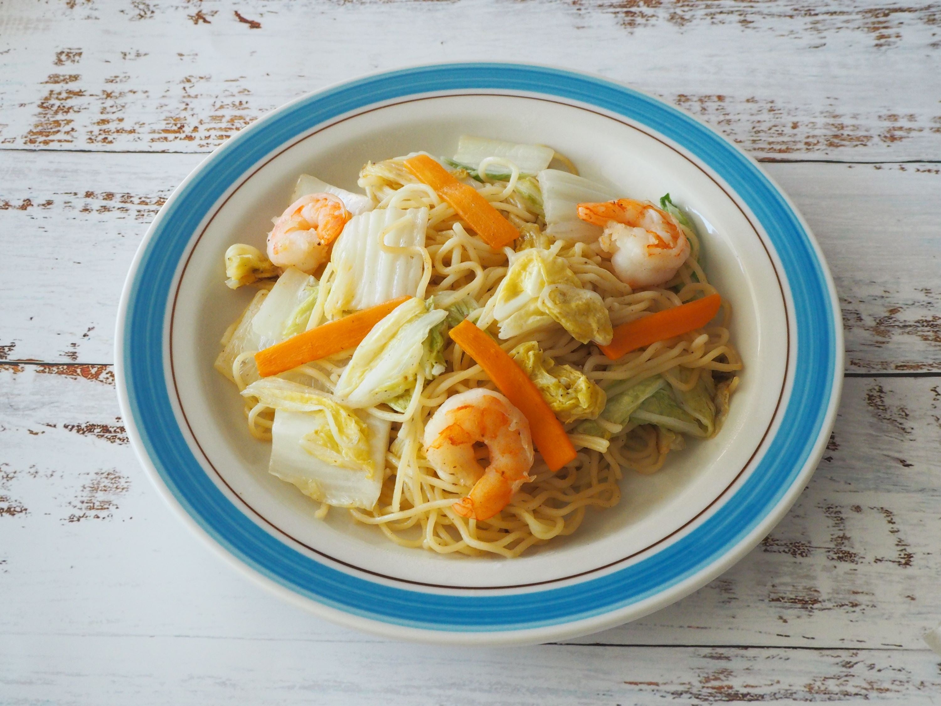 えびの風味が引き立つシンプルな塩焼きそばです。冷凍えびを使うことで手軽にできる一品です。