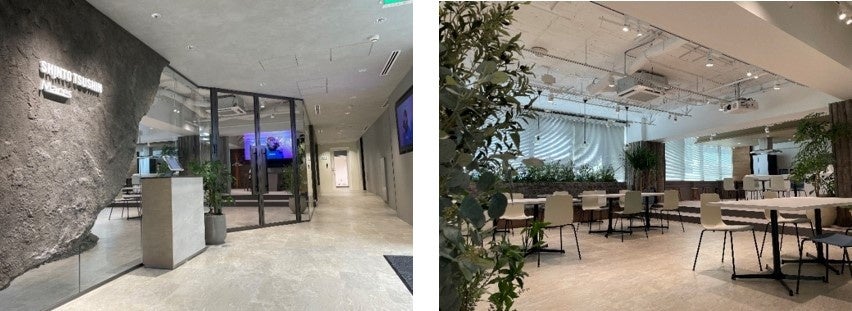 新オフィスの2階には、『おもしろキッチンDIS+H(ディッシュ)』*という名称の257.46㎡のキッチン付きラウンジを新設しました。日々のミーティングからイベント利用まで、様々な用途で利用できる空間であることに加え、キッチンを併設することで、食を通じて対面コミュニケーションを活性化させることを目指しています。今後は社員や出張シェフなどが腕をふるい、ランチやカフェタイム、懇親会などにも、本ラウンジを利用していきます。