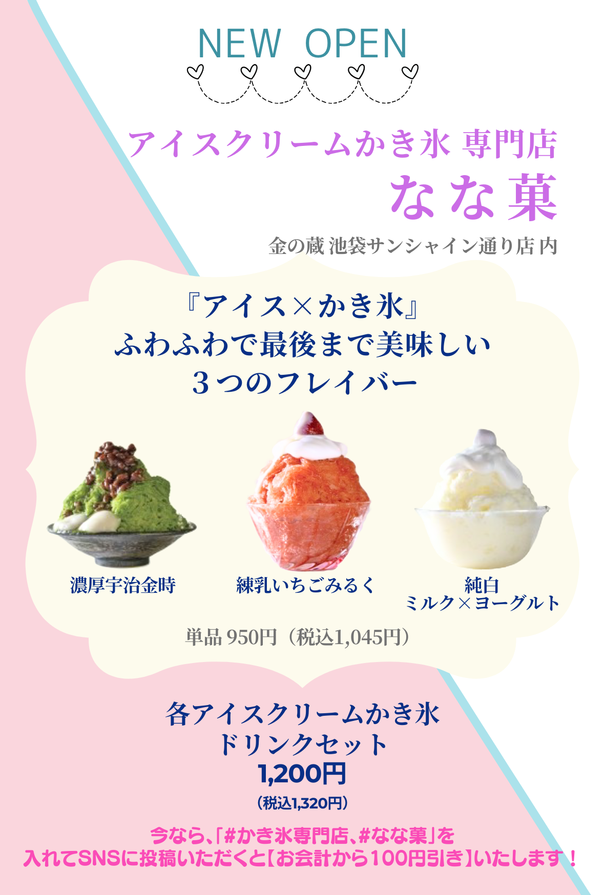 当社の最大席数をもつ金の蔵池袋サンシャイン店では、夏の期間限定でかき氷専門店「なな菓」を9月18日(月・祝)まで延長いたします。待たずに入れるエアコンの効いた涼しい空間と冷たいかき氷で、晩夏のお出かけストレス解消の一助にぜひご活用ください。