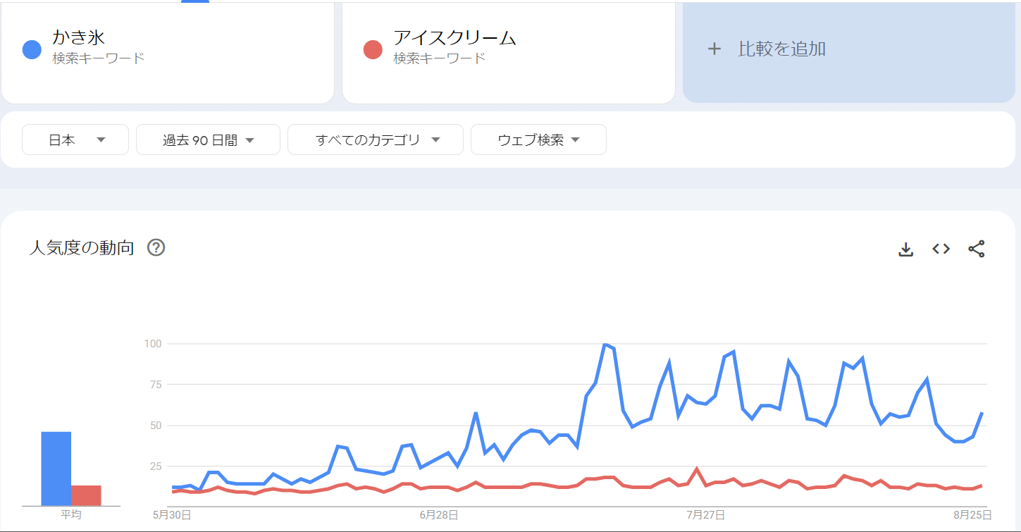 日本全国で真夏日が珍しいものではなくなり、続く熱帯夜と、身体は過酷な環境にさらされています。Googleトレンドでは、アイスクリームよりかき氷の検索が5月中旬から現在まで大きく伸ばしています。より冷たさを感じる氷菓やかき氷が自然と求められると考えられます。