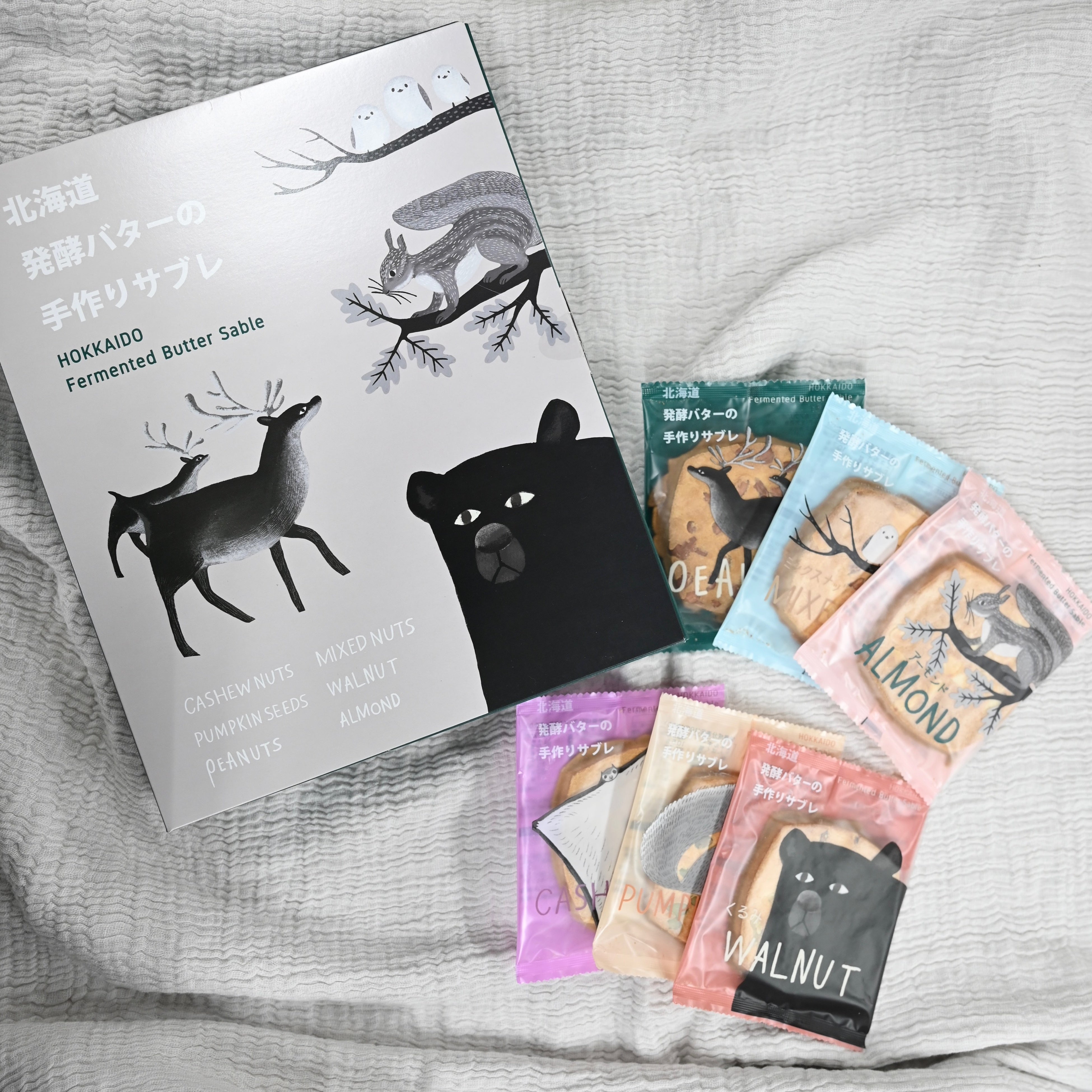 関東エリアのスーパーマーケット初!昨年、人気だった牛乳サブレのタケダ製菓から、かわいらしいパッケージのサブレが新登場。パッケージデザインは、北海道に自生する木の実を主として食べる動物たちがモチーフになっています。裏面は子どもたちとワンちゃんが道内を旅しながら、動物たちに巡り合う楽しいストーリーです。アソートボックスを開けると6種類のサブレがずらりと並びます。(クルミ、ミックスナッツ、アーモンド、カシューナッツ、かぼちゃの種、ピーナッツ)北海道産小麦、アルミニウムフリーのベーキングパウダーを使用しています。1枚ずつ小分けになっており、各種2枚(計12枚)入りなので一つずつ誰かに差し上げても、お子さまと分け合って召し上がっていただいても!噛みしめるたび、じんわり広がる味わいをお楽しみください。