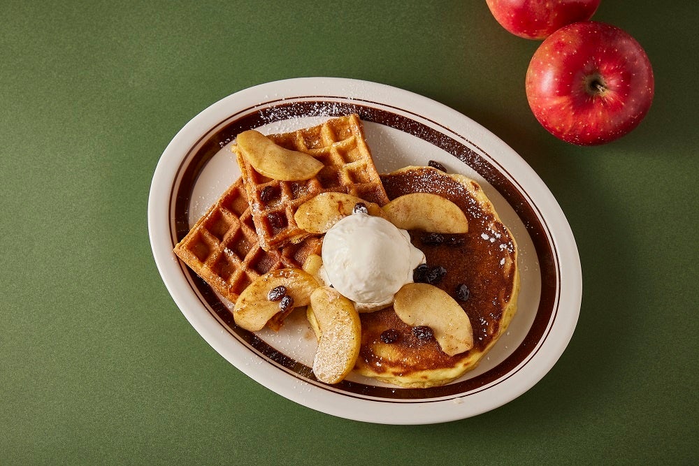 固めのワッフルとふわふわのパンケーキの組み合わせが良く、メープルシロップの量によって味の変化も楽しめます!シナモン風味の焼きリンゴに秋の風味を存分に感じました。ボリューム満点なので、何人かでシェアしながら食べるのもおすすめです。