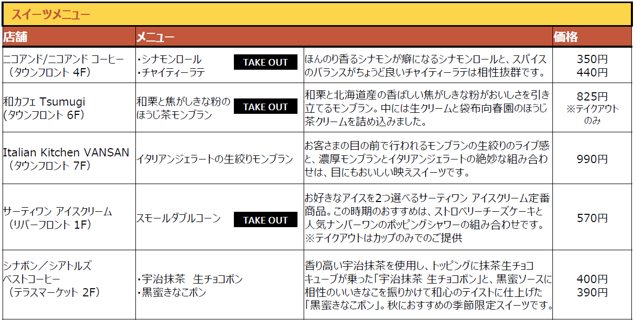 他にも、「秋の魅力発見!グルメ&スイーツ」企画に参加している店舗では、この秋ぜひ味わっていただきたいグルメやスイーツを多数ご用意しています。
