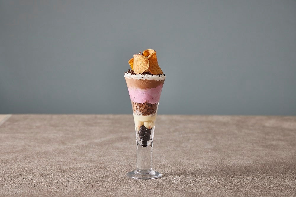 福井県産のさつまいも「とみつ金時」とマスカルポーネを使用したスイートポテトのようなクリーム、チョコレートアイス、カシスのホイップクリームで仕立てた秋限定のパフェです。