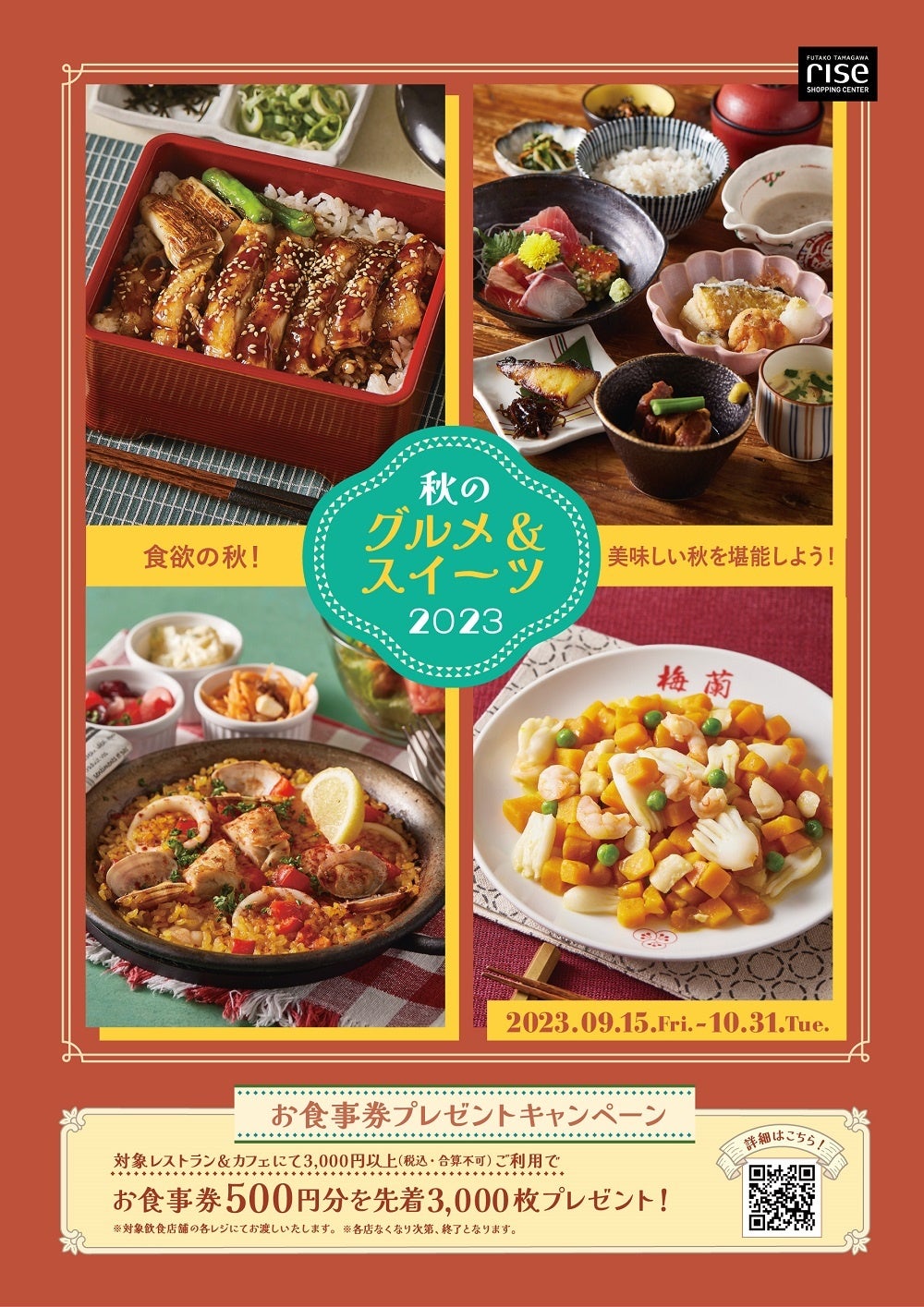 期間中は、「秋のグルメ&スイーツ 2023」に参加する店舗にて、3,000円以上(※)ご利用いただいた方先着3,000名様に500円分のお食事券をプレゼントします。