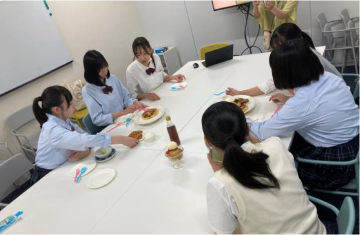 プレゼンテーションでの提案内容をもとに、店舗がメニューを開発し、6月末には試作メニューの試食会を実施。試食した生徒からは、「見た目にインパクトがあって映える」「お皿や盛り付け方を変えたらどうか」といった、見映えに関する意見が出たほか、「味の種類を変えながら食べられるのがうれしい」「秋らしさやレトロ感を感じた」「フルーツを増やしてはどうか」など、さまざまな切り口からアイデアが飛び交いました。