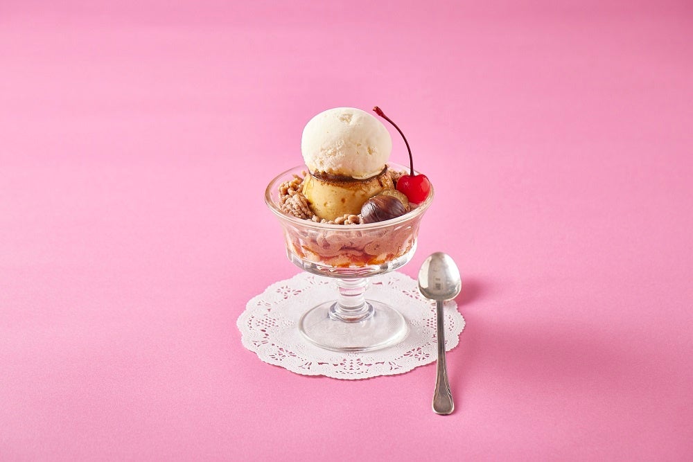 卵の風味がしっかり感じられる昔ながらの固めプリンに、バニラアイスと風味豊かなマロンクリームを合わせ、秋らしいパフェに仕立てました。中学生の皆さんが大好きなものを詰め込んだ、ボリューム満点のスイーツです。