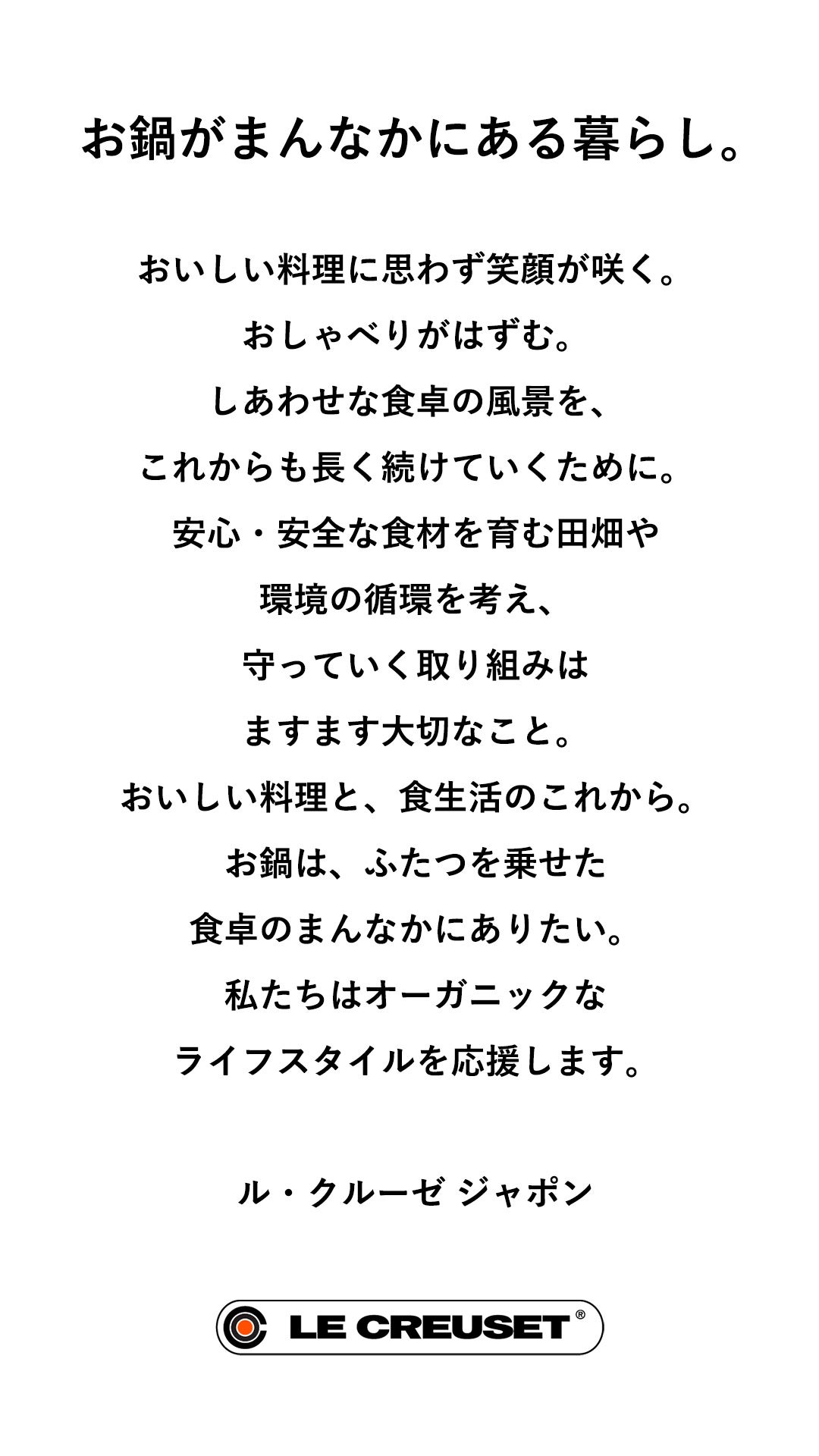 気候変動など、環境問題に対して真剣に向き合わなければならないいま、持続可能な社会を目指す取り組みは、ますます重要になっていくと考えます。ル・クルーゼ ジャポンは今回の取り組みを機会に、レシピの啓蒙のみならず、安全・安心な食材を育む環境の重要性など、食生活のこれからにも配慮した活動に取り組んでまいります。