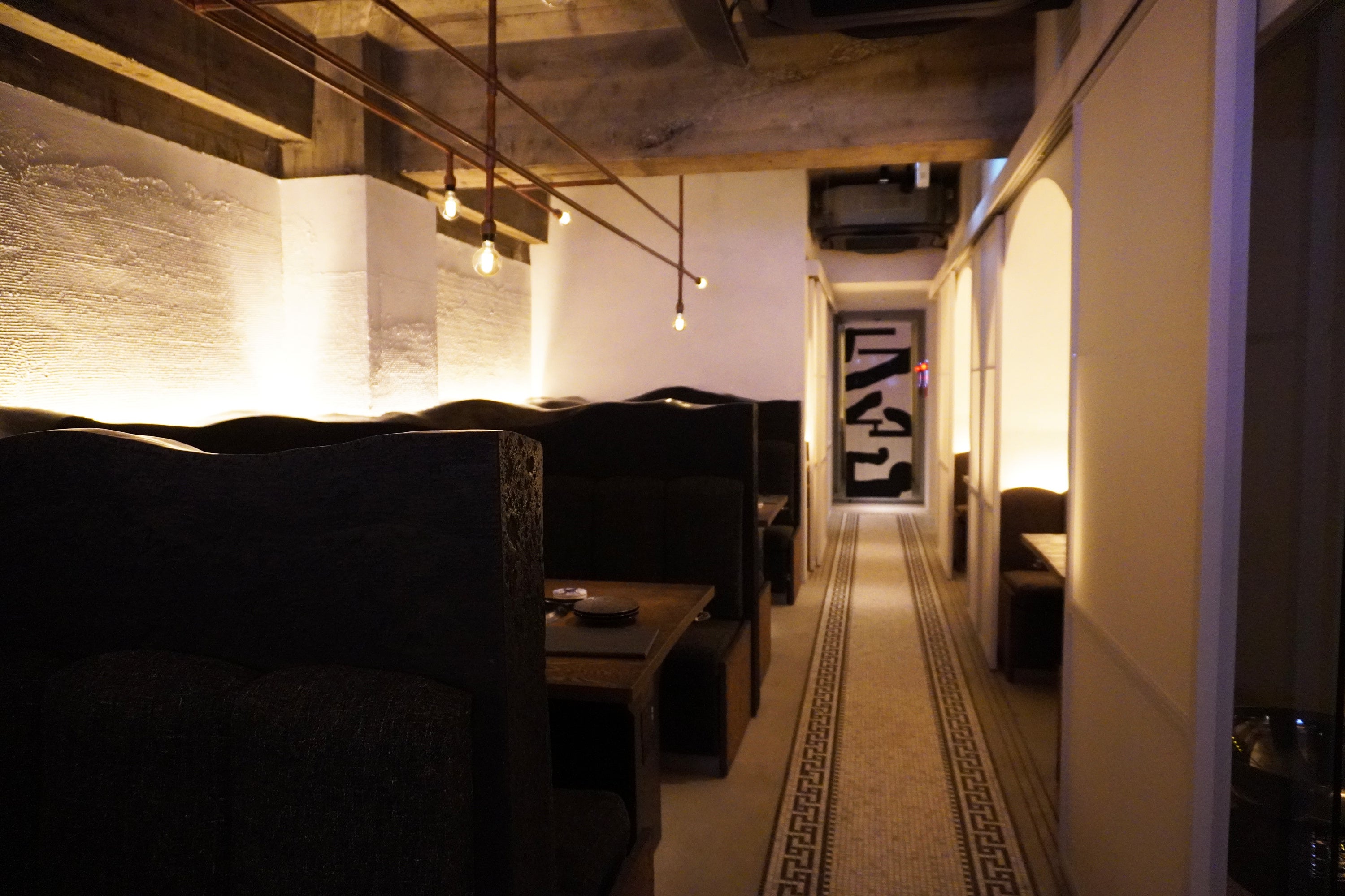 店名の ”LAVA” はポルトガル語で「火山から流れる溶岩」を表し、 “29” は「肉」と、元素周期表29番の「銅」を掛けています。店内は、火山や溶岩のモチーフを取り入れたモノクロトーンのシンプルな空間。そこに銅素材をアクセントとして加え、重厚な高級感がありながらも温かみを感じられる落ち着きある空間デザインになっています。