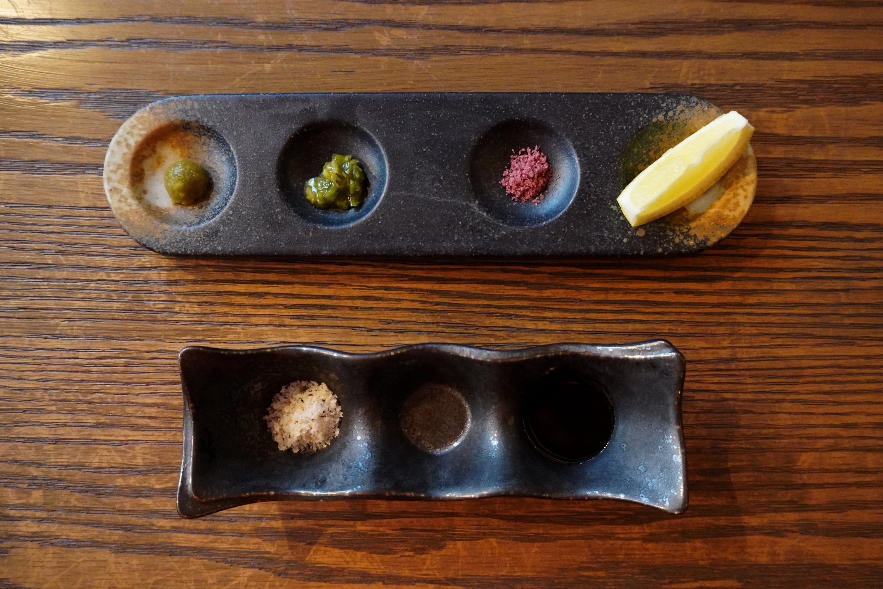 また、そのままでも充分美味しいお肉を引き立てる調味料として、レモン・岩塩・ワイン塩・ワサビ・柚子胡椒をお出ししております。自分好みの味をぜひ見つけてみてください。
