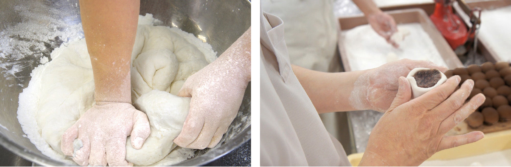 薯蕷(じょうよ)とは山の芋のこと。 京都では上用(じょうよう)饅頭とも呼ばれ、古くから婚礼の引出物や お配り饅頭他、各種お祝いに使われます。 鶴屋吉信の薯蕷饅頭は、丹波産の上質なつくね芋をすりおろし、砂糖と上用粉(お米の粉)を加えて手早く、力強くこね上げた生地を使用します。よく揉みこねることで、コシと弾力のある薯蕷生地ができあがります。